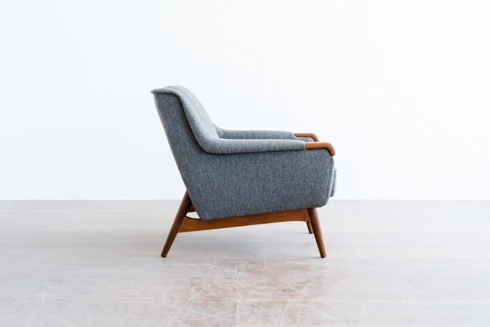 脚部もチーク材で構成することで、張り包みの安定感にウッドフレームの軽やかさが合わさり