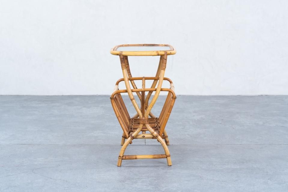 ラタン素材で編み込まれた1台。軽やかな見た目通り片手で運べるほどの軽量ながら、しっかりと細部まで編み込まれた作りなので、実用性も問題のない小家具です。