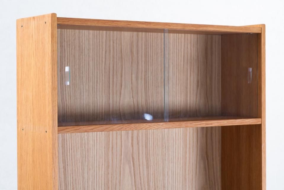 オープンスペースのシェルフと、クローズドの引き違いガラス扉と下部キャビネット。