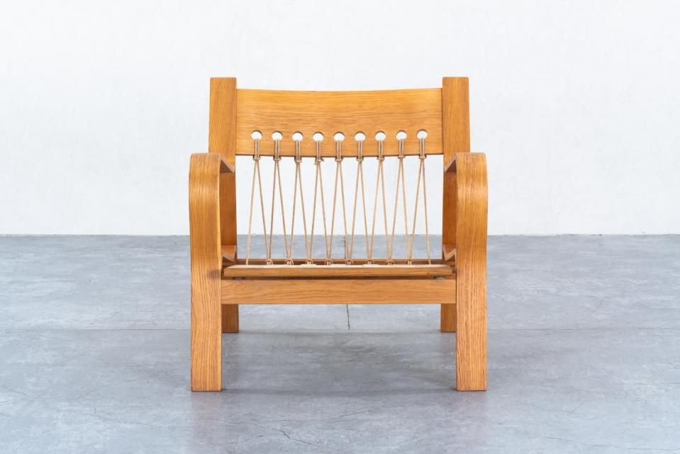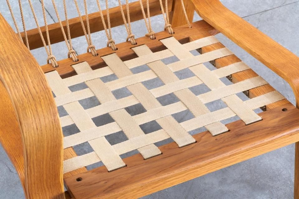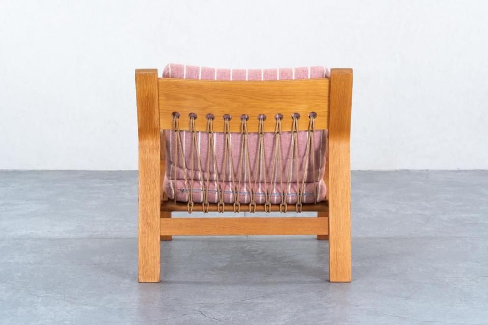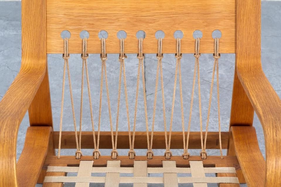 ウェグナーの他のプロダクトにも使われるフラッグ・ハリヤードという、ヨットの帆を張る時にも使われる程の丈夫なロープで編んであり、座枠のフレームの後ろを吊って支えています。このロープという素材感がウェグナーの家具群の中でたまに見かける独特でいて柔和なアクセントとして一味違う表情を加えてくれています。