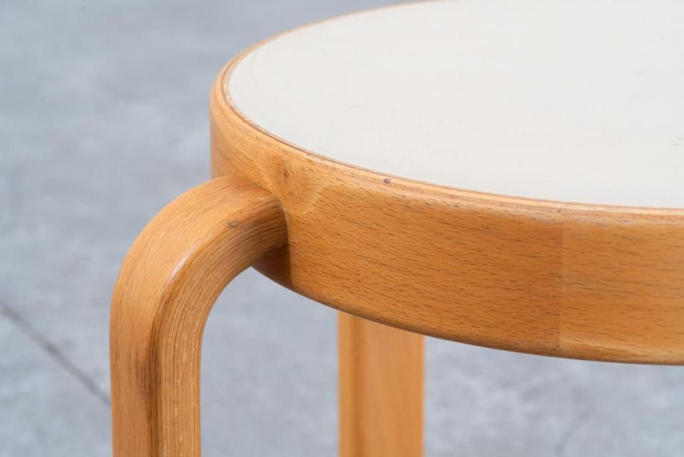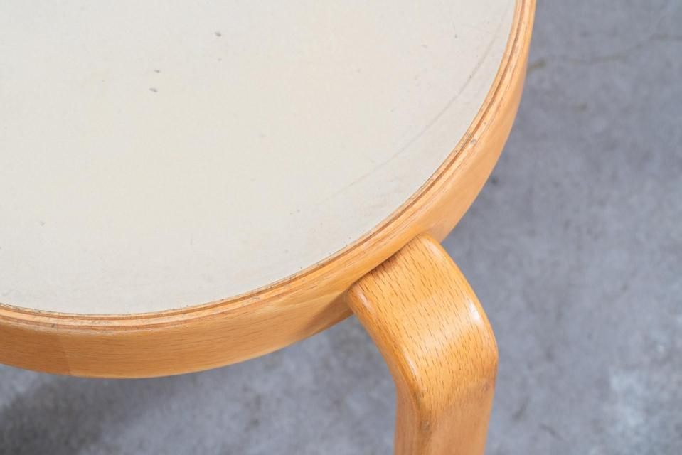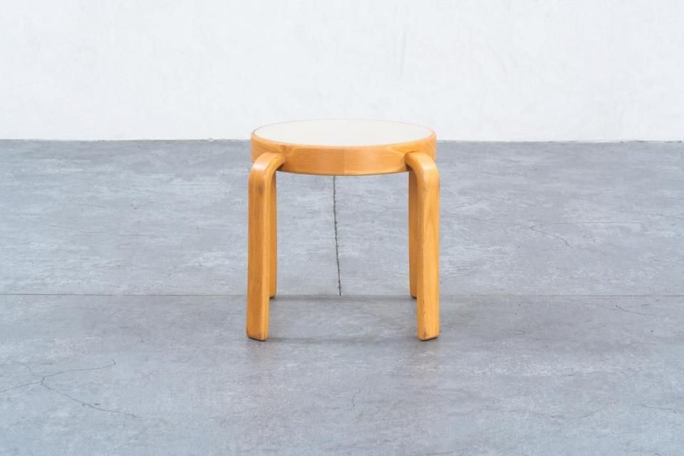 アイコニックな脚部と座面の接合部はネジや釘を使わず固定されており、デンマーク家具らしい技術力とデザイン性の高さを感じられます。スツールとしてはもちろん、オブジェのようにインテリアの一部として取り入れても楽しめる一脚。経年変化したビーチ材と風合いのあるリノリウム材のコンビネーションが美しく、観葉植物を置いても絵になります。